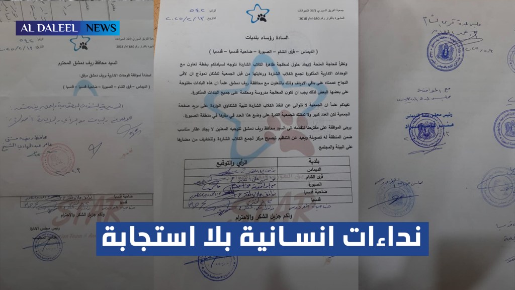 أرسلت المحتسب مديرة جمعية “الفريق السوري لإنقاذ الحيوانات – ستار”، كتاباً رسمياً إلى رؤساء بلديات قدسيا وضاحيتها، الديماس، قرى الشام والصبورة، تتضمن خطة متكاملة لإنقاذ الحيوانات الشاردة، من خلال جمعها، تعقيمها، تلقيحها، ترميزها، وإنشاء محميات مخصصة لها. إلا أن هذه المبادرات لم تلقَ حتى الآن أي استجابة من الجهات المعنية، وأكدت أن تلك الكتب الرسمية ما تزال منذ فترة طويلة على مكاتب وزارات الزراعة، الإدارة المحلية، والشؤون الاجتماعية.